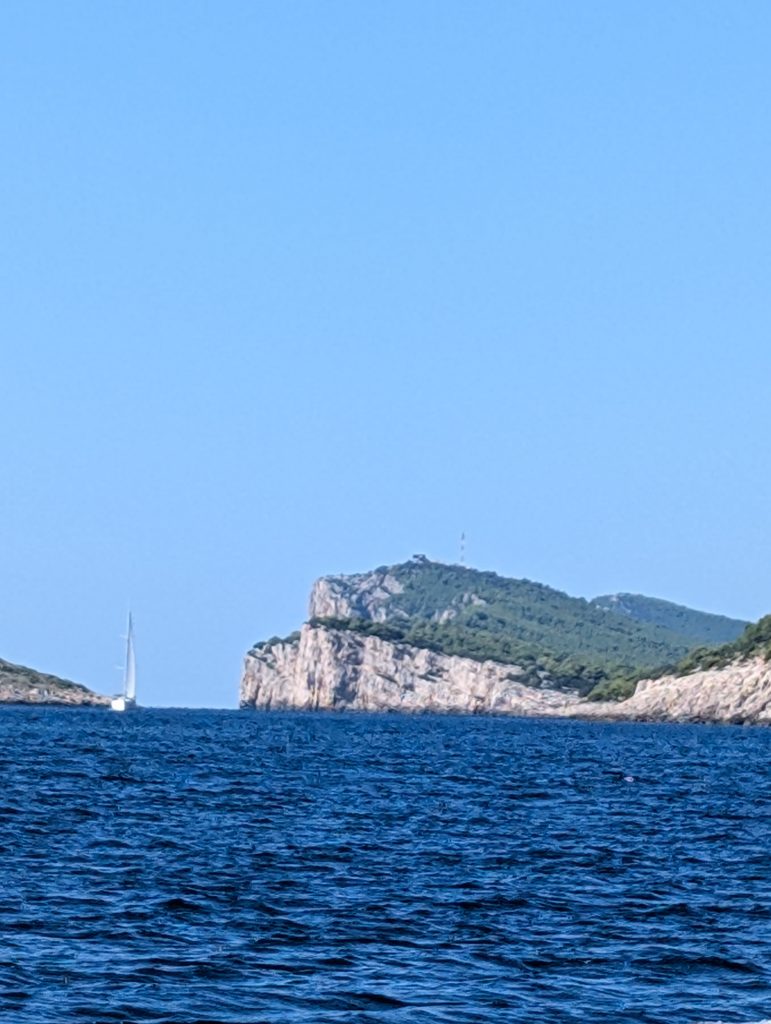 Von Zadar segelten wir bei herrlichem Wind rund 10 sm Richtung Bucht Soline. Obwohl schwacher Wind angesagt war, lief es wie geschmiert. Die Ansteuerung lautete: „Hinter der Huck rechts rein.“
