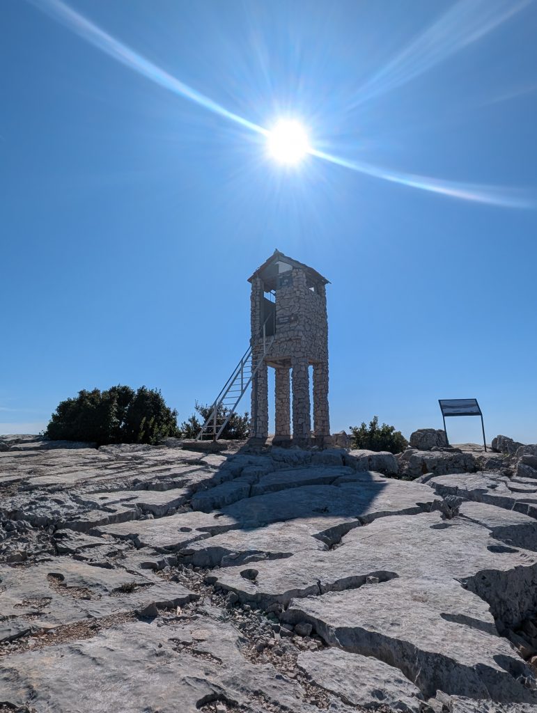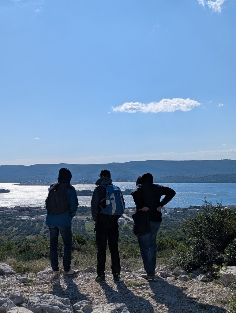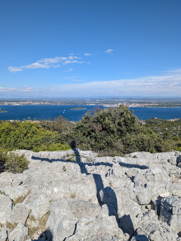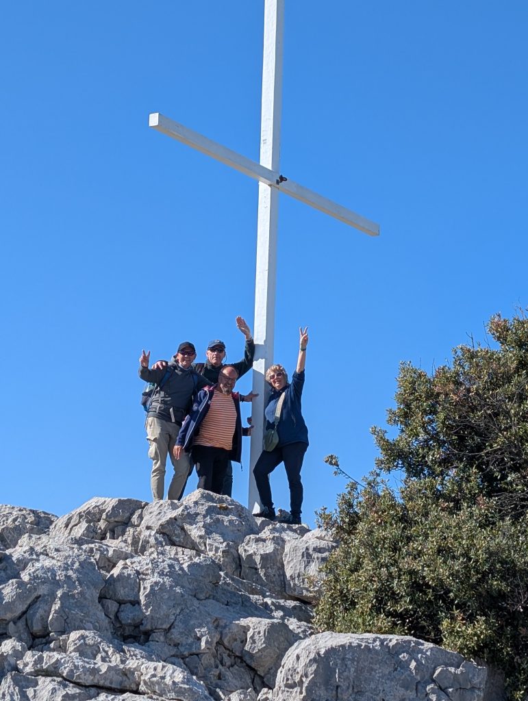 Ein mutiges Wandertrüppchen setzte mit der Fähre zur Insel Pašman (Tkon) über. Nach nur 15 Minuten begann der Aufstieg Richtung Aussichtsturm und ein Gipfelkreuz lag noch auch noch auf dem Weg, das über schroffe Felsplatten erreicht werden konnte.