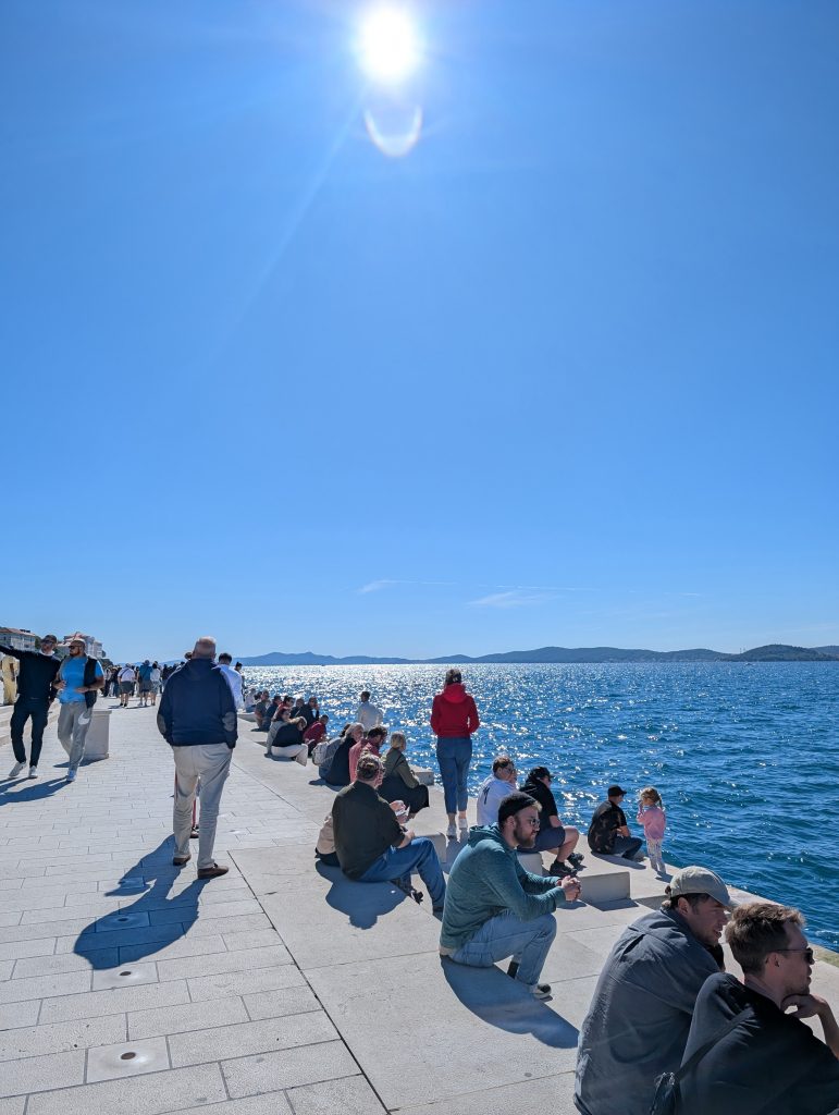 Schon um 7:30 Uhr fuhr das erste Taxi zum Flughafen. Andere hatten noch Zeit und nutzten sie für einen letzten Zadar-Besuch. Es gab köstliche Fischburger, Kaffee im Sonnenschein, Cappuccino am Meer – und natürlich Entspannung an der Seeorgel.
